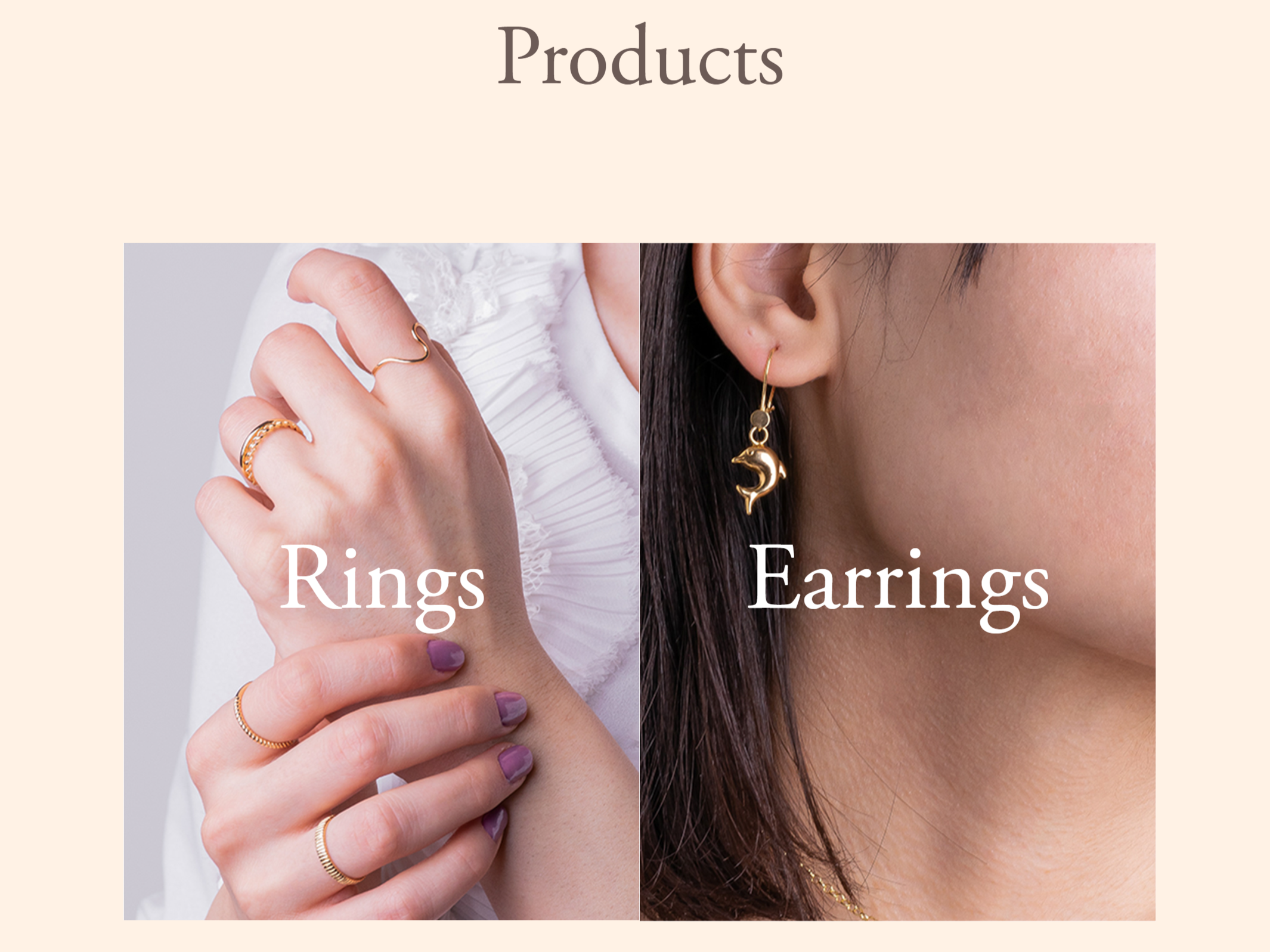 - Productsの部分は文字と写真を組み合わせてカテゴリーのリンクにすることで、パッと見てどの商品カテゴリーへのリンクなのかわかるようにしました。