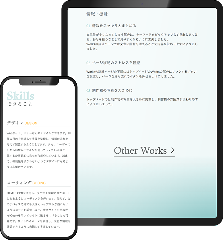 就職活動に使用するポートフォリオサイトであるため、誠実なイメージを保ちつつ自分の好きなデザインを取り入れることで個性も伝わるサイトにしました。