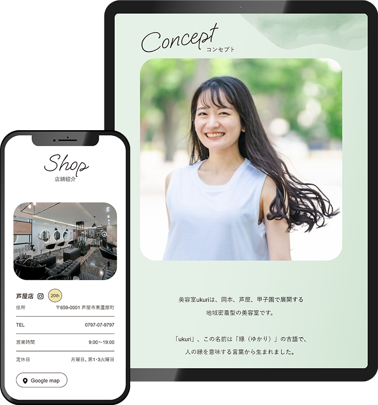 また、それぞれの店舗のInstagramとGoogleマップにとべるようにしました。更に、20周年の芦屋店と新店舗の甲子園店には目立つようにその旨を記載しました。
